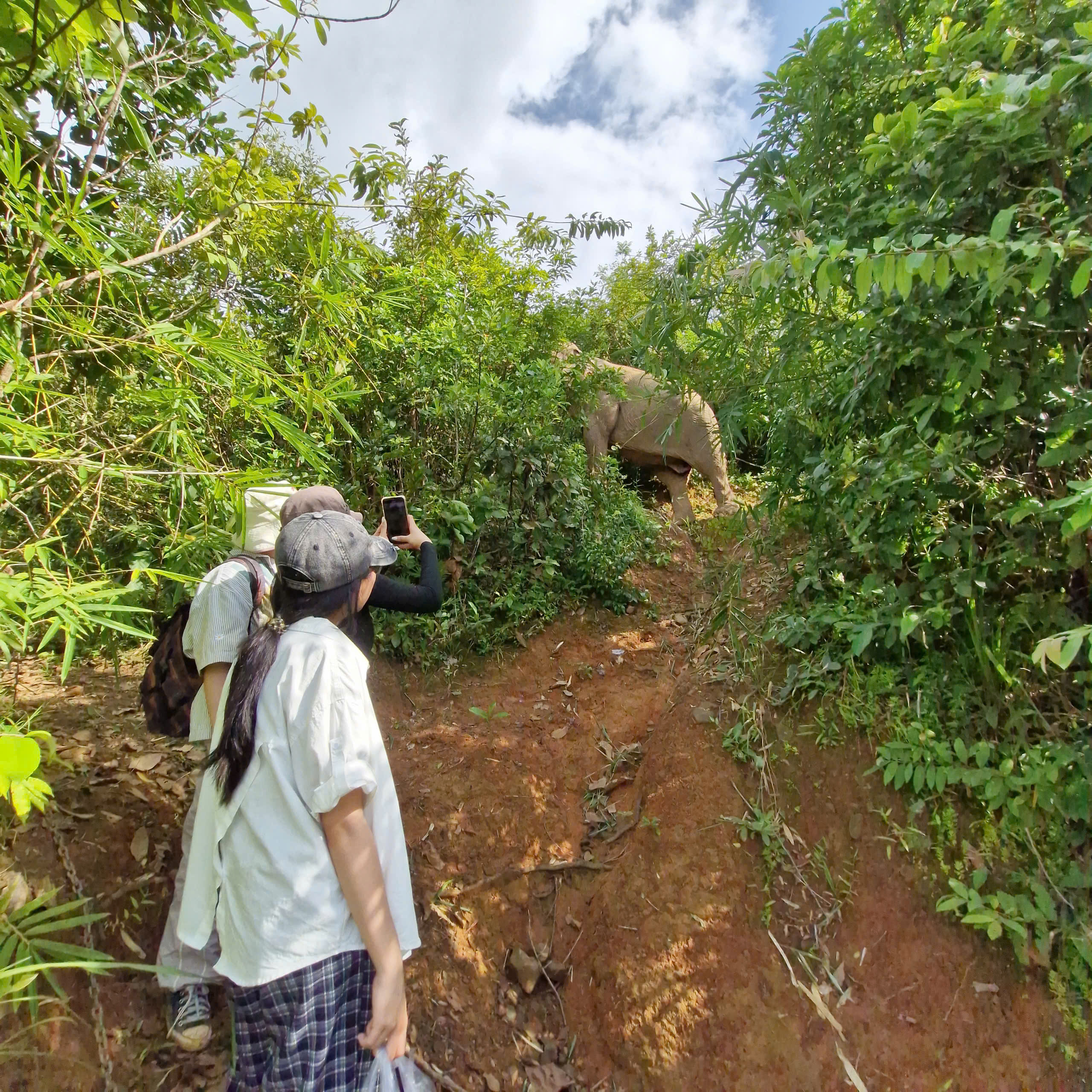 Du khách đang theo chân voi Ban Nang đi vào rừng tìm kiếm thức ăn